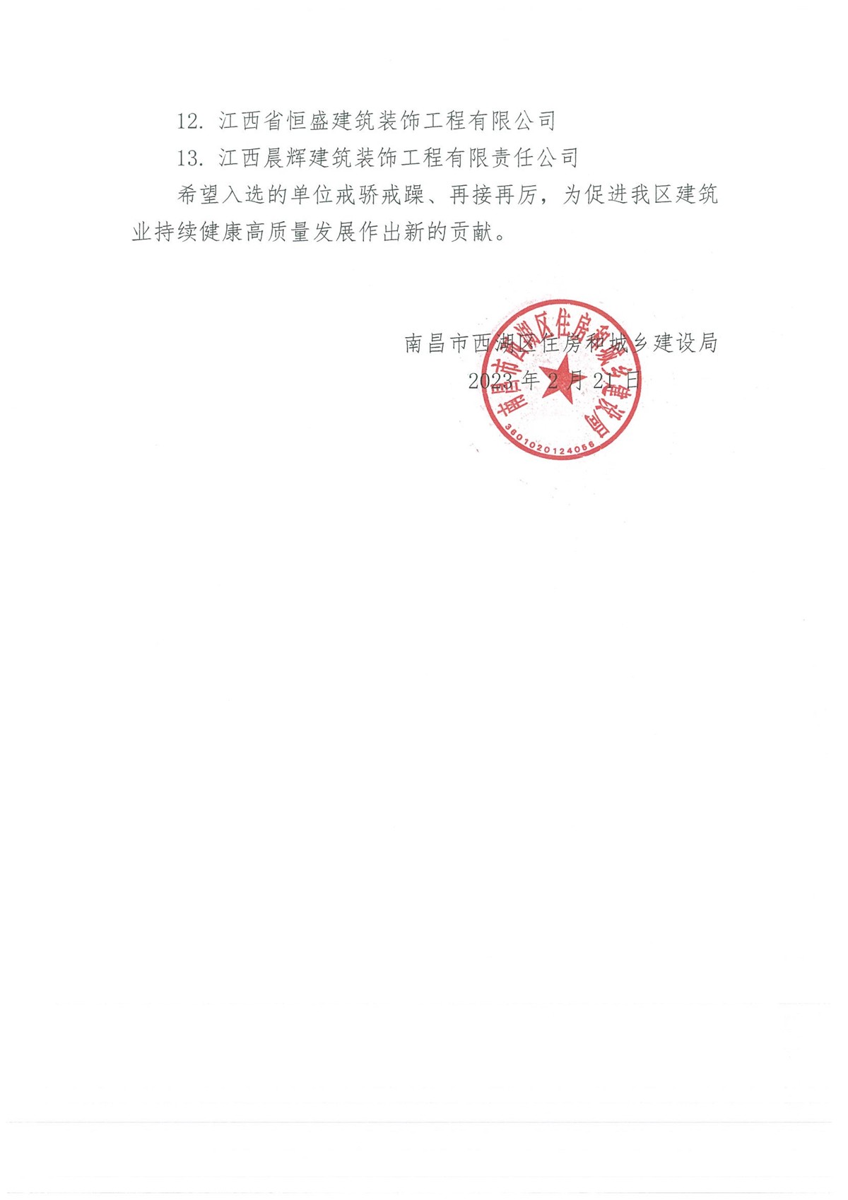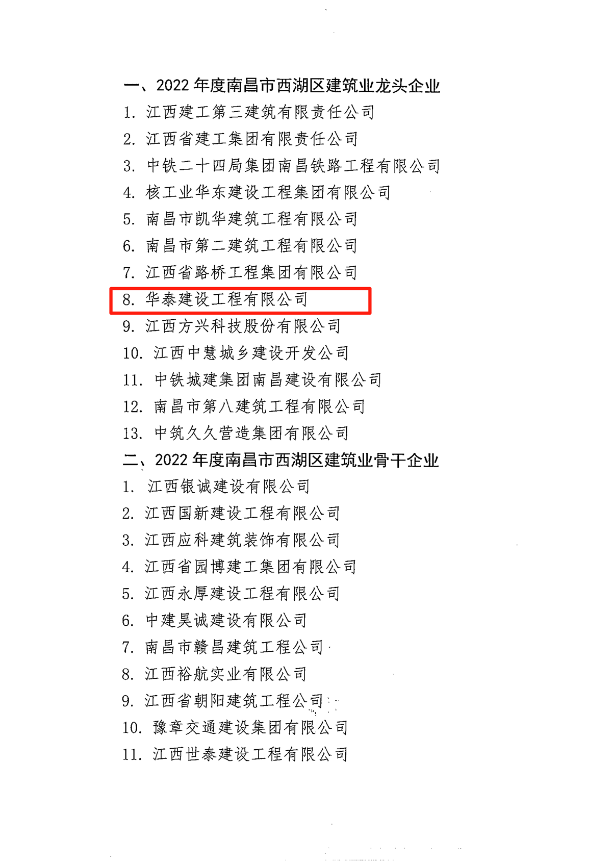 2023年2月21日,恰逢農歷二月二龍抬頭,在這個紅紅火火的日子,南昌市西湖區住房和城鄉建設局發布了《關于公布2022年度南昌市西湖區建筑業龍頭企業、骨干企業名單的通報》,經層層嚴格考評認定,華泰建設工程有限公司憑借實干篤行與卓越品質獲得“2022年度南昌市西湖區建筑業龍頭企業”榮譽稱號!